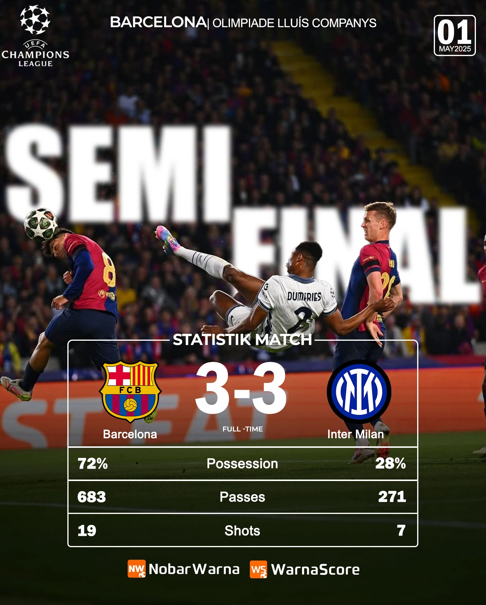 Laga semifinal Liga Champions antara Barcelona dan Inter Milan benar-benar menyuguhkan drama luar biasa! Pertandingan berakhir dengan skor 3-3, hasil yang menggambarkan duel ketat penuh aksi dan emosi hingga menit akhir.