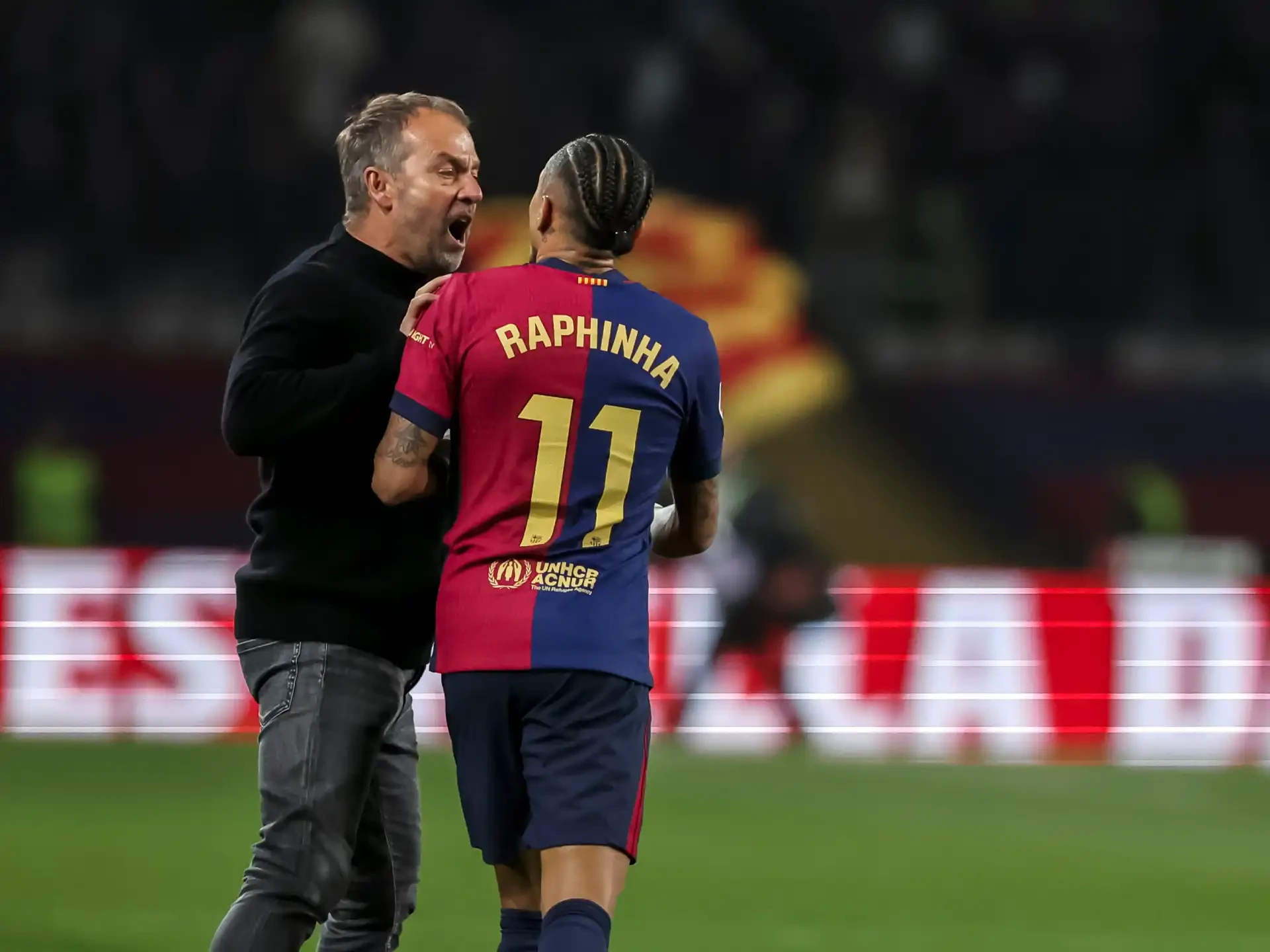 Usai pertandingan tersebut, Flick terlihat larut dalam emosi di bench. Ada Raphinha yang berada di depannya. Pada momen tersebut Raphinha mengucapkan sesuatu kepada Flick yang terlihat menggeleng-gelengkan kepala.