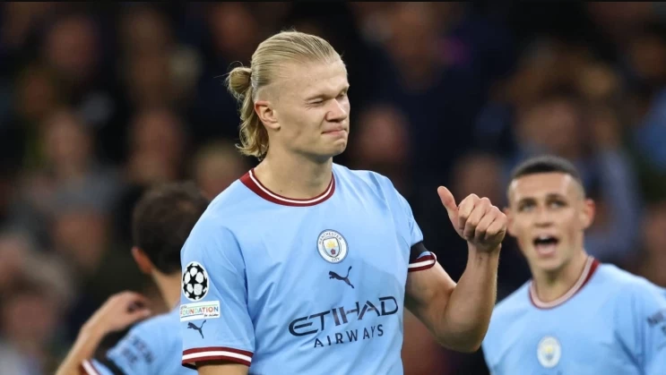 Pada momen tersebut, Haaland terlihat menunjuk lambang juara Liga Inggris yang tersemat di bahu kanan jersey Man City. Ia seperti hendak menegaskan predikat Man City sebagai juara bertahan.