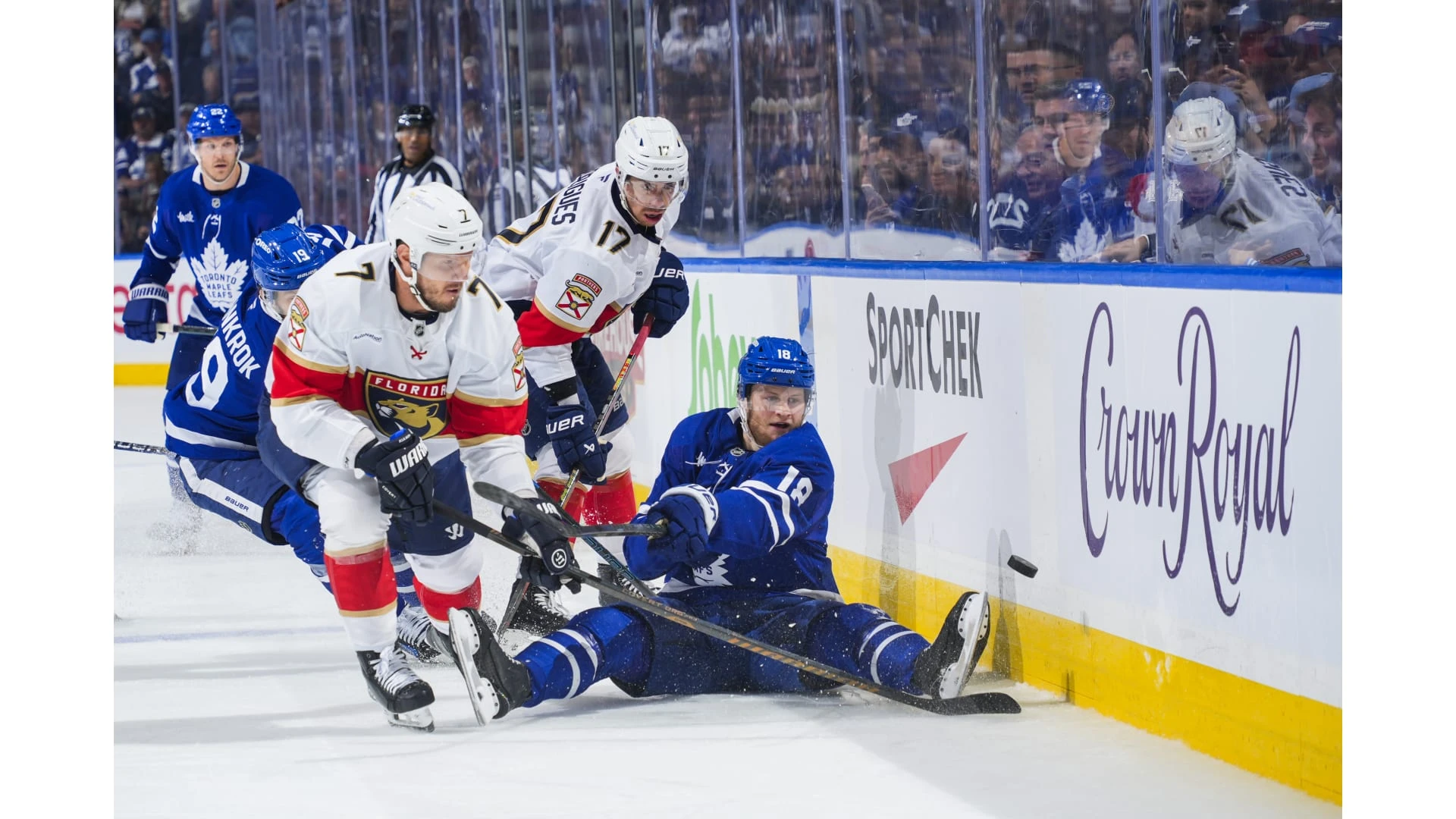 Toronto Maple Leafs memimpin seri 2-0 setelah kemenangan dramatis 4-3 atas Florida Panthers pada 7 Mei 2025. Mitch Marner mencetak gol penentu kemenangan hanya 17 detik setelah Panthers menyamakan kedudukan di awal periode ketiga.