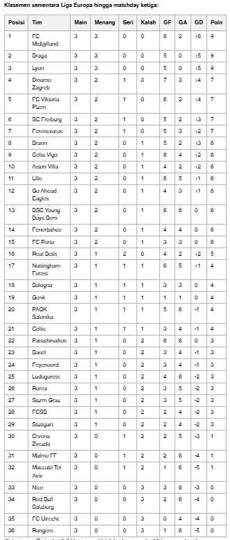 Midtjylland memimpin klasemen sementara dengan sembilan poin penuh. Klub asal Denmark itu baru saja meraih kemenangan telak 3-0 atas Maccabi Tel Aviv, memperkokoh posisi mereka di puncak.